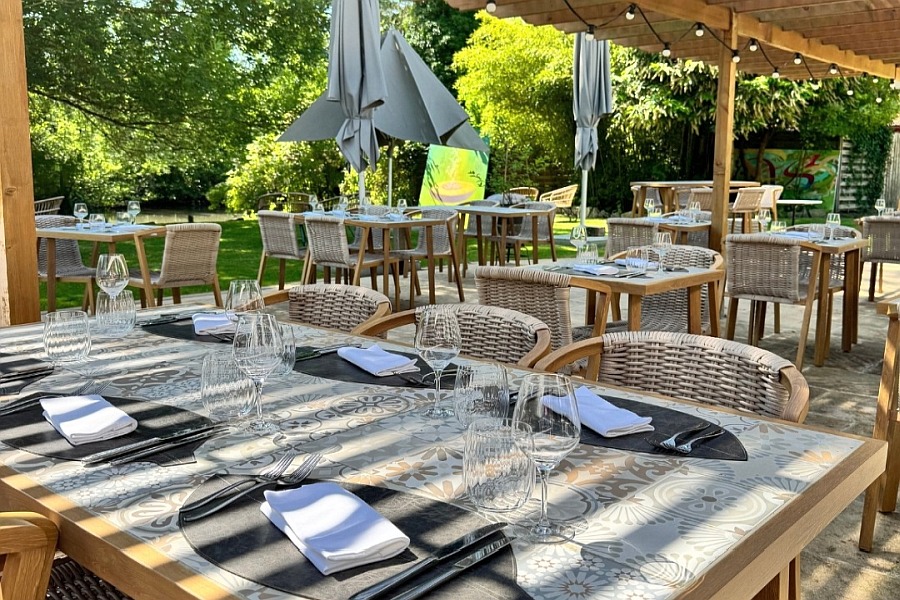 Salle à manger spacieuse et claire, entourée de baies vitrées au mobilier chiné, au sein de l'ancienne grange du domaine; terrasse le long de la rivière;