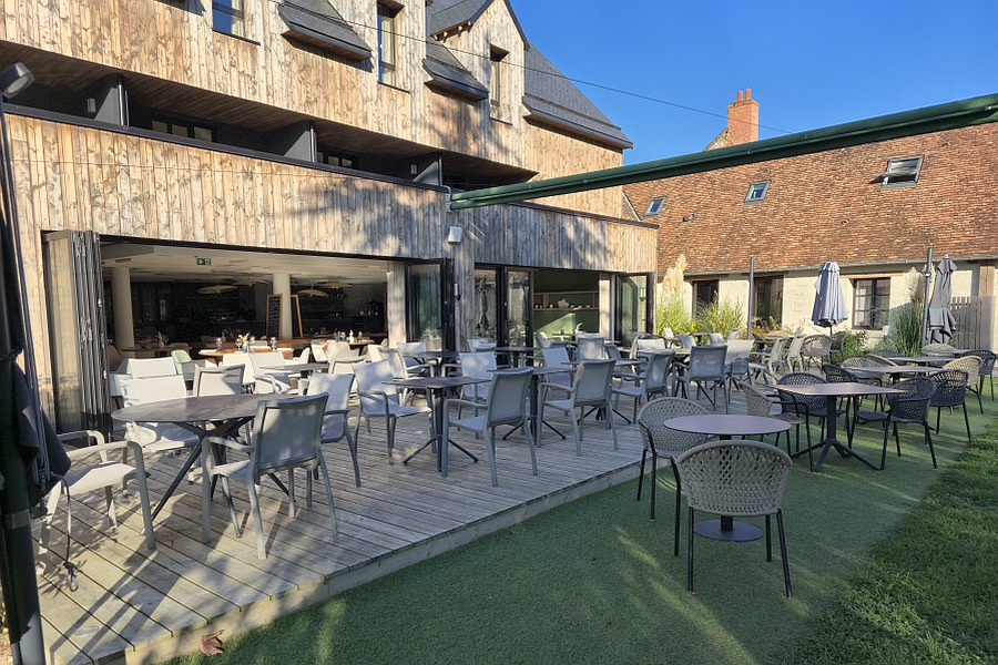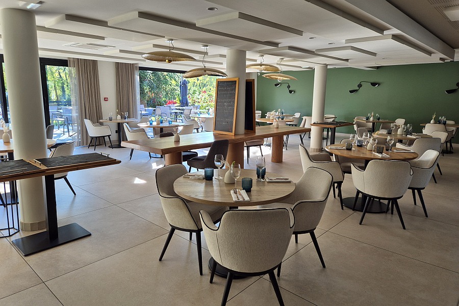 LE BISTROT Salle à manger contemporaine au décor sobre et élégant; grande terrasse dans un environnement de verdure;