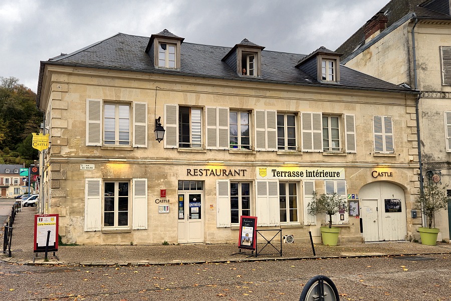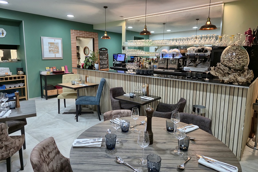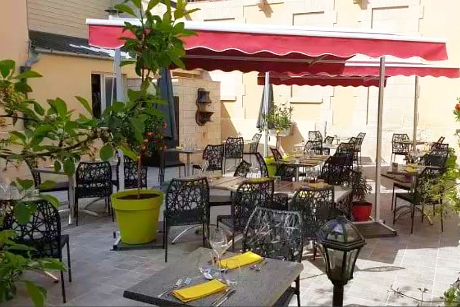 Restaurant au pied du château; salle à manger l’ambiance conviviale et chaleureuse; cour-terrasse intérieure;