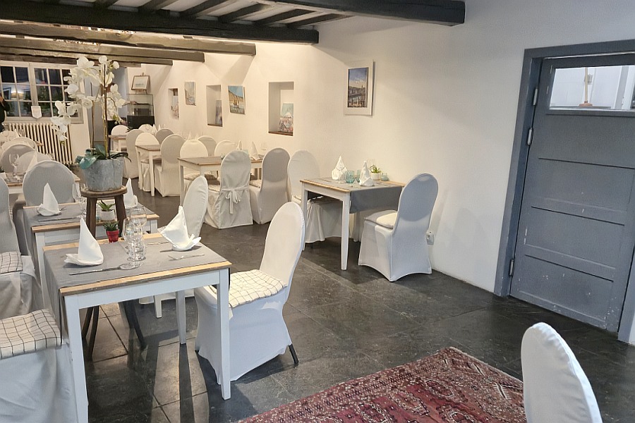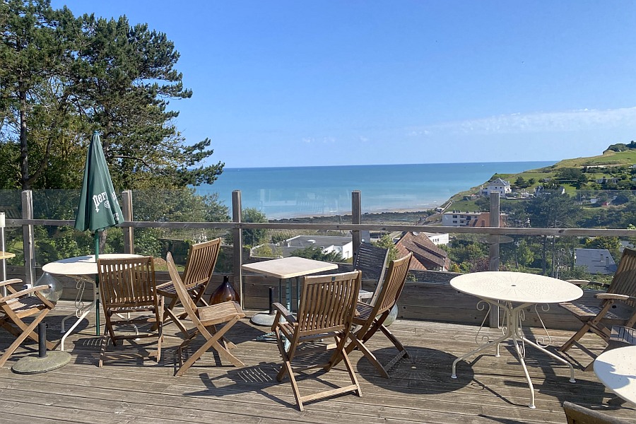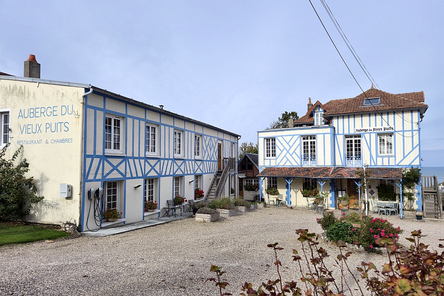 Auberge Normande récemment restaurée, bâtie en 1850 avec une vue plongeante sur la mer et les falaises; salle à manger chic; terrasse dominante;