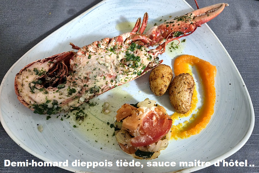 cuisine terroir: Demi-homard froid avec sa mayonnaise maison - Fricassée de champignons de la saison sur un lit de purée de butternut - Noix de coquilles saint jacques juste snackées aux herbes fraîches et flambées au whisky - Demi-homard dieppois tiède, sauce maître d'hôtel et ses légumes de saison - Ananas flambé au rhum de Madagascar et sa boule de vanille. Ouvert tous les jours midi et soir.