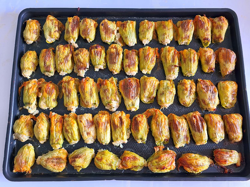 Faire une petite boule de farce avec une cuillère à café, poser sur la fleur ouverte, refermer et replier les bouts, les ranger dans un plat allant au four. Arroser d'un filet d'huile et enfourner à 180° pendant 20 minutes. A déguster en entrée chaude.