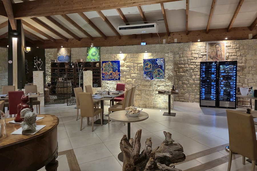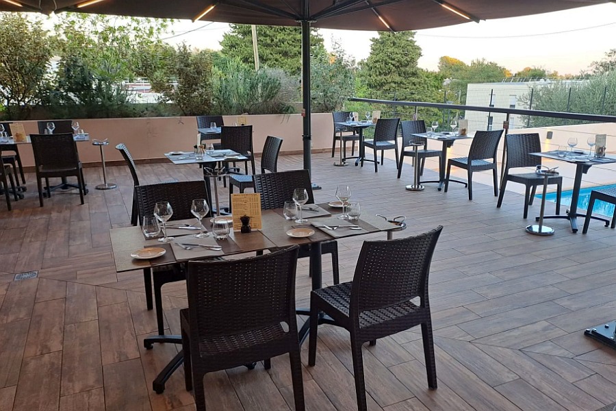 Restaurant familial exceptionnel, excentré sur la route de Saint Laurent du Var; grande salle à manger au cadre raffiné et cosy et tables espacées très confortables sous une belle charpente bois; terrasse ombragée sous les parasols, quelques tables avec vue sur la piscine (privée);
