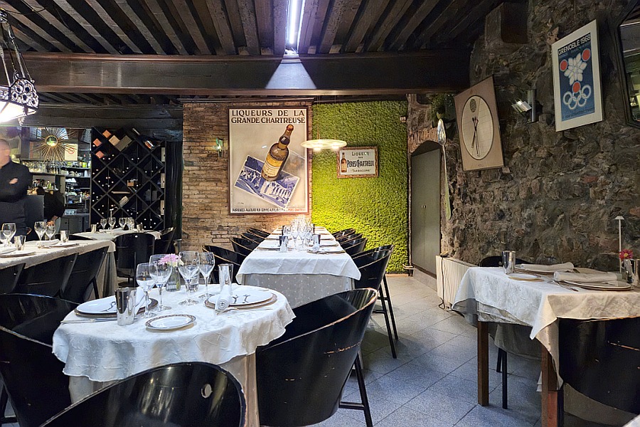 Institution de Grenoble depuis près de quatre décennies, à deux pas du musée; salle à manger entre bois et pierres aux tables bien dressées; terrasse sur le devant;